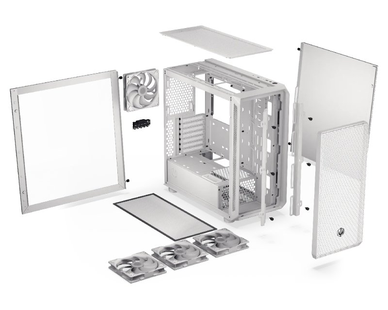 Osnovne karakteristike – Format kućišta: Mid Tower Podržani formati matičnih ploča: ATX,microATX,Mini-ITX Napajanje – Snaga napajanja: Bez napajanja Unutrašnja ležišta – Unutrašnja 3.5″ ležišta: 1 (pretvaranje 2.5 inča/3.5 inča Combo Bay) Unutrašnja 2.5″ ležišta: 6 (4+2) Priključci napred – USB 3.2: 1 Tip C,2 Tip A Audio: 2x 3.5mm Ležišta za ventilatore – Prednja strana: 3x120mm ili 2x140mm Poleđina: 1x120mm ili 1x140mm Donja strana: 1x120mm Gornja strana: 3x120mm ili 2x140mm Ugrađeni ventilatori – Prednja strana: 3x120mm (ARGB) Poleđina: 1x120mm (ARGB) Ležišta za hladnjake – Prednja strana: 120mm,240mm,280mm,360mm Poleđina: 120mm,140mm Gornja strana: 120mm,140mm,280mm,360mm Kompatibilnost – Maksimalni broj slotova: 7 Maksimalna visina procesorskog hladnjaka: 179mm Maksimalna dužina grafičke karte: 410mm Fizičke karakteristike – Dimenzije: 489mm x 486mm x 228mm Boja: Bela Reklamacioni period – Reklamacioni period: 36 meseci