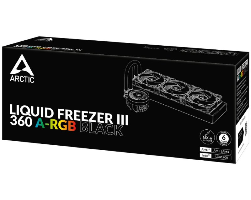 Osnovne karakteristike – Tip: Vodeno hlađenje Procesorsko ležište (socket): AMD AM4,AMD AM5,Intel 1700 Upotreba: Za centralne procesore (CPU) Radijator – Dimenzije: 398mm x 120mm x 38mm Materijal: Aluminijum Ventilatori – Broj ventilatora: 3 Dimenzije: 120mm x 120mm x 25mm Broj obrtaja: 200 – 2000rpm Protok vazduha: 48.82cfm Vazdušni pritisak: 1.85mmH2O Ležište: FDB – Fluid Dynamic Bearing Boja: ARGB Fizičke karakteristike – Boja: Crna Reklamacioni period – Reklamacioni period: 72 meseca