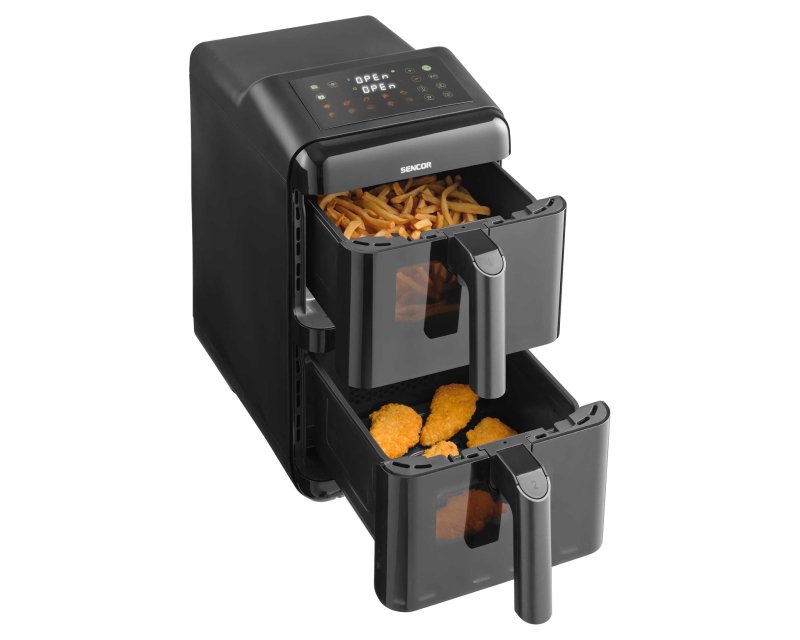Karakteristike – Tip: Friteza na vruć vazduh Snaga: 3.000W Temperatura: od 40°C do 200°C Nivoi: 5.8l donji nivo,5.8l gornji nivo Fizičke karakteristike – Boja: Crna Dimenzije: 500mm x 450mm x 180mm Težina: 9.7kg Pakovanje: 2 korpe Zapremina: 11.6l (dve posude) Ostalo – Dodatne funkcije: Automatsko isključivanje nakon 60 minuta,Digitalni displej,Drške otporne na toplotu,Tajmer Napomena: 10 programa,Mogućnost pranja odabranih delova u mašini za sudove Podržane tehnologije: Prženje bez ulja Reklamacioni period – Reklamacioni period: 24 meseca