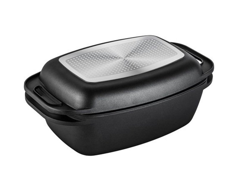 Karakteristike – Zapremina: 9l Dimenzije: 43cm x 26.2cm x 12.1cm Materijal: Liveni Aluminijum Boja: Crna Broj komada u setu: 1 Primena: Gorionik na gas,Indukciona ploča,Rerna,Ringla,Staklokeramička ploča Ostalo: Nelepljiva površina Stanje: Nekorišćeno Reklamacioni period – Reklamacioni period: 36 meseci